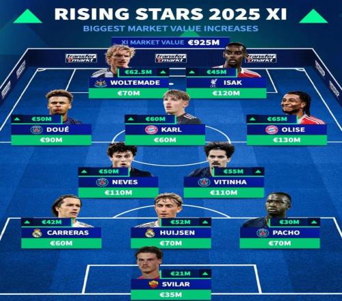 德转列2025年身价涨幅最高11人阵容: