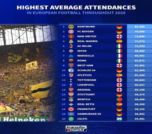 北京时间12月31日,德转列出了2025年欧洲俱乐部场均上座人数TOP20,多特蒙德以超8.1万人高居第一,拜仁慕尼黑7.5万人第二,曼联约7.4万人第三,皇家马德里约7.3万人第四。
